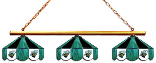 Customize your billiards room while also showing your team pride with this licensed three shade stained glass lamp. Three 14-inch stained glass shades are color coordinated to the team colors while the team logo is screen-printed on the variety of panels (six in all). Plus, each piece of glass is hand cut and soldered into proper place with great care and precision, giving your room a classy antique look. The lamp includes a ceiling mount canopy kit and includes all the necessary hardware to install it. The lamp measures 54 inches long by 14 inches wide by 14 inches tall and weighs 30 pounds.