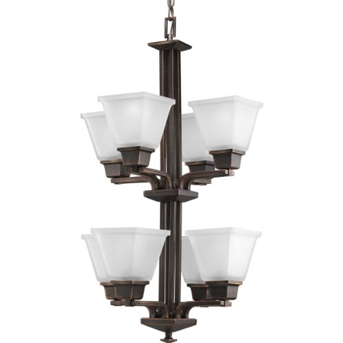 Progress Lighting P3907-74 Eight-light foyer fixture with clean linear forms, twin arching arms and square etched glass. Creates a modern interpretation of two blended styles: Craftsman and Mission. Venetian Bronze North Park Collection Venetian Bronze 8-light Chandelier The North Park Collection is a modern interpretation of the classic Craftsman style. Popular from turn-of-the-century through the 1930's, this artistic style continues to see renewed popularity due to it's clean, simple and honest designs. North Park features unique arching linear arms which support etched glass to provide a softly diffused lighting effect. Venetian Bronze finish Etched glass 18 In. Diameter x 32 In. Height Uses (8) 100-watt medium base bulbs