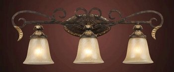 This elegant 3-light bathroom fixture conveys the rich ambiance and elegance synonymous with the Trump brand. The Regency lighting collection features solid cast iron scrollwork in a burnt bronze finish. Caramel amber glass combines with flourishes of weathered gold to complete this distinctive look. From Trump Home by Elk Lighting.