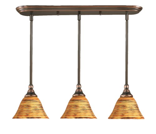 The Toltech Lighting 25-BC-454 Multi Light Mini-Pendant Black Copper Finish with Firr Saturn Glass Shade, 7-Inch is a ceiling light that features a 7-Inch charcoal spiral glass shade. canopy: w 4.75-Inch by l 24-Inch by h 2.5-Inch comes with 3-6-Inch, 6-12-Inch, and 3-18-Inch stem sections. Product dimensions (in Inch): 6.25 H by 7 W. Fixture requires 3 100-Watt medium base incandescent bulbs, not included. Product safety tested and approved by the UL/CUL in the US and Canada. Assembly required. This model is also available in the following finishes: Brushed Nickel, Bronze.
