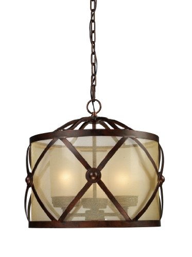 Elk Lighting 14051/3 Cumberland Chandelier An outer drum made of criss-crossing iron finished in classic bronze encloses a light amber organza diffuser. An additional layering element is the matching finished mini- chandelier, within the fixture, that is properly accented with frosted blown glass shades. W:19" H: 17" Classic Bronze