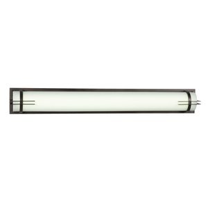 Finish:Oil Rubbed Bronze, Size:Large, Light Bulb:(2)32w T8 Med Bi-Pin Linear Fluor Corbett fluorescent bath & vanity light. Frosted white glass Some assembly required