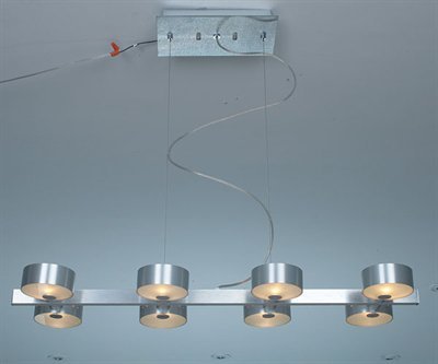 Finish:Brushed Aluminum, Light Bulb:(8)40w T4 G9 120v Halogen Satelite 8 light pendant features acid-etched glass. Lights rotate 360 degrees.