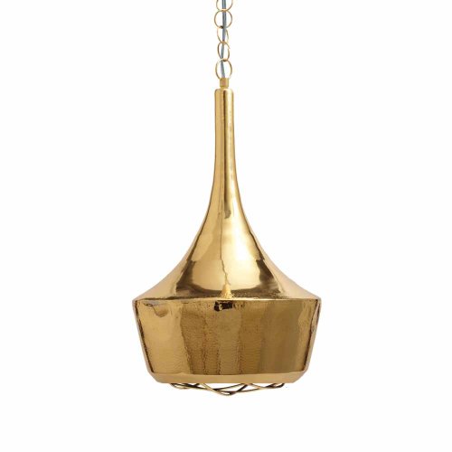 The Gold Hammered Pendant Light by Lazy Susan is handcrafted of thin sheets of brass. Artisans expertly work the metal to create the intriguing texture, and then polish it to accentuate the natural sheen. We include a coordinated canopy, and the chain measures 36" in length. A standard 60 watt bulb suggested. Available in three sizes, the large measures 15-Inch diameter by 25-Inch in height. Hardwired. Due to the nature of these artisan crafted pieces, some slight variations in size, shape, or color is considered normal.
