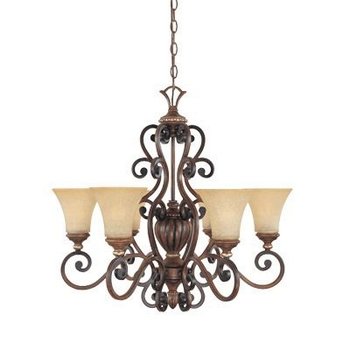 Designers Fountain 81586-BWG Montreaux Collection 6-Light Chandelier features a rich Burnished Walnut with Gold Accent finish and warm Navajo Dust glass shades in an elegant traditional design sure to enhance any decor for years to come with the classic lines. Hang in an entry for a touch of warm charisma, or over a dining room table for a stylish statement. The 81586-BWG is 28.75-Inch wide x 26.75-Inch high, and includes 3-Feet of chain. The fixture requires six 100-Watt medium base incandescent bulbs (not included), dimmable using a standard incandescent dimmer. The 81586-BWG comes one per package. Designers Fountain has been a leading manufacturer and distributor of decorative and functional residential lighting the United States since 1985. Headquartered in a state-of-the-art facility in the Los Angeles area, our products are available through a network of authorized lighting showrooms, distributors and internet experts throughout North America. Our philosophy is to continue to provide the highest quality products to meet all your lighting needs. Whether you are searching for traditional, transitional or contemporary styling, the breadth of our product line allows you to indulge your creative instincts at an affordable price.