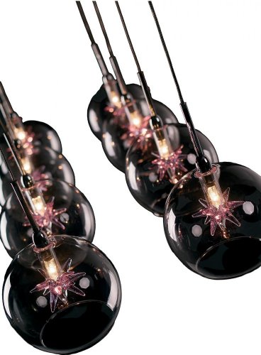 ET2 E20107-21 Starburst 8-Light Pendant Satin Nickel It was Shakespeare that said, "The stars above us, govern our conditions." And so it is with this amazing multi-light pendant series. Each unique glass cover supports handmade glass starbursts - available in clear, blue, green, amber or violet - suspending each burst of color in its own glass globe. Chrome hardware and a satin nickel-finish canopy complete each structure, and every little piece is adjustable to enhance your galaxy in a variety of different ways.