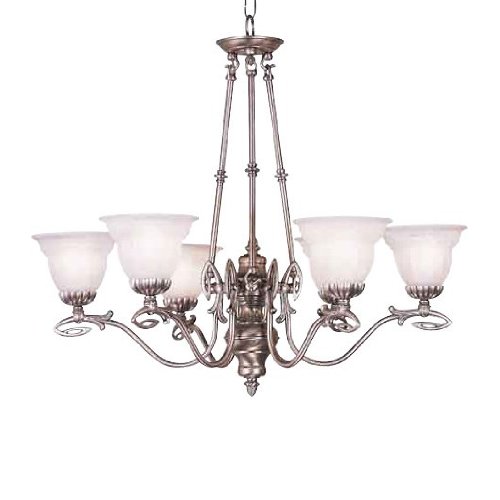 Finish:Colonial Pewter, Diffuser:Alabaster, Light Bulb:(6)60w A19 Med F Incand Monaco six-light chandelier. Includes 6 feet of chain and 10 feet of wire.